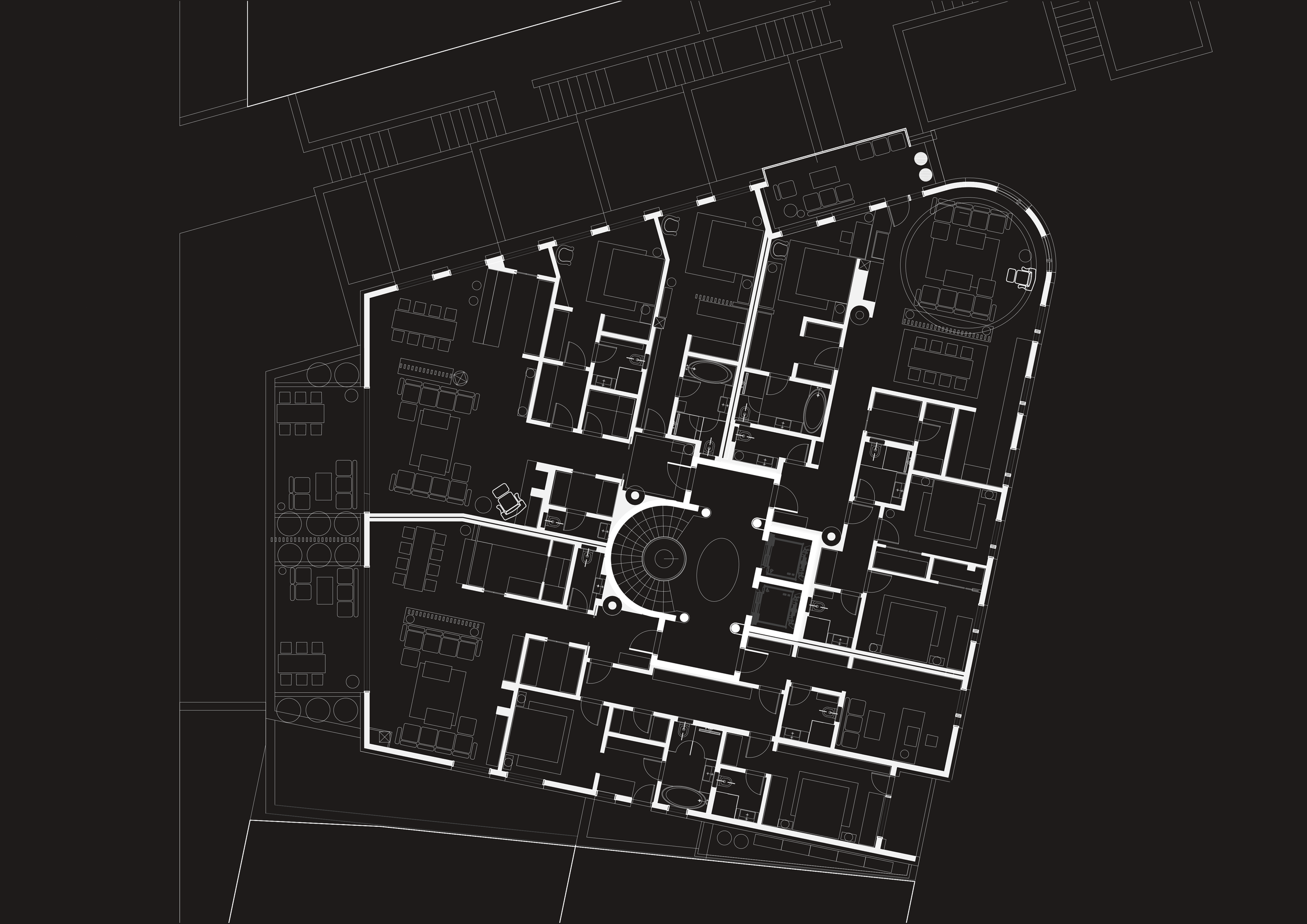 This project was developed as a competition entry for a housing development in Belgrade’s historic district of Kosančićev Venac. The site sits between two embassies and the Rectorate of the Faculty of Applied Arts, overlooking the Sava River and adjacent to the culturally significant public stairway known as the “Big Steps.”